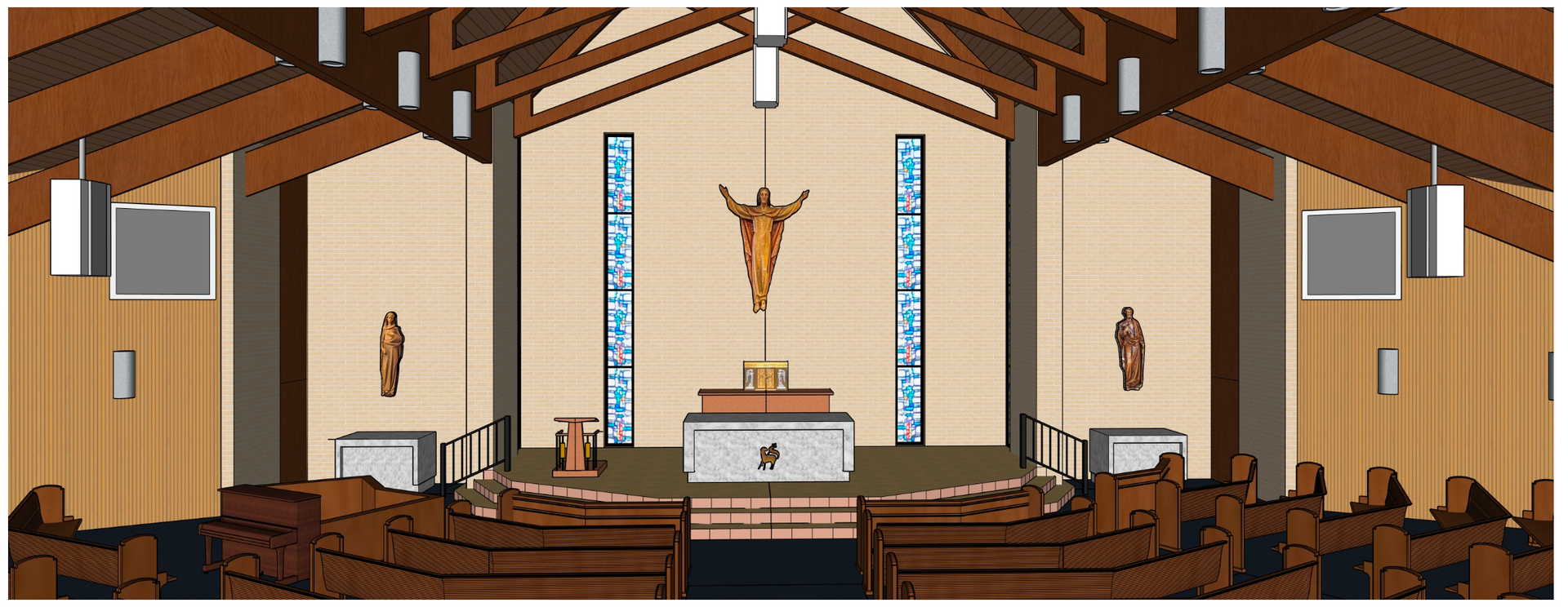 There will be some extra items throughout the church that will be suggested for us to make more ornate for the glory of God. One of those items is to put a background and border behind our stations of the cross in order to make them stand out more. Another item is to add a back high altar to the sanctuary in order to bring more focus and awareness to the tabernacle and altar. These projects are being designed by Studio Io.